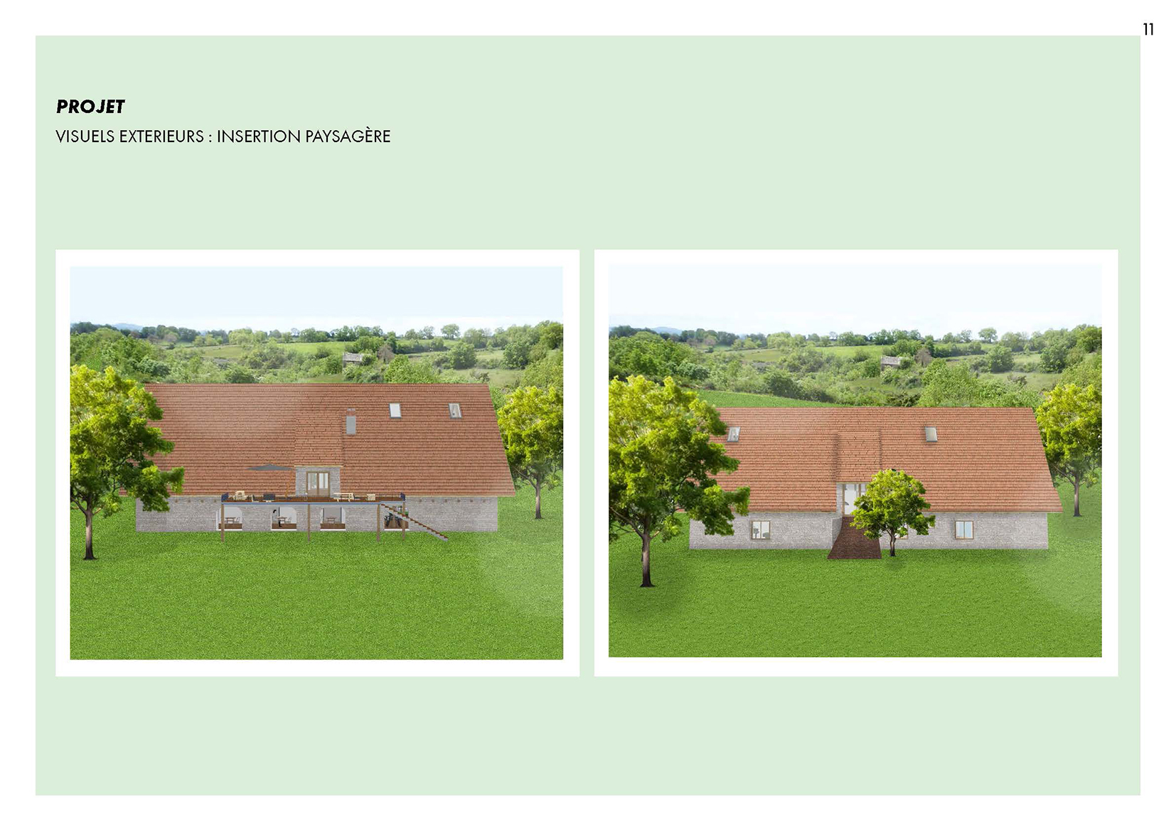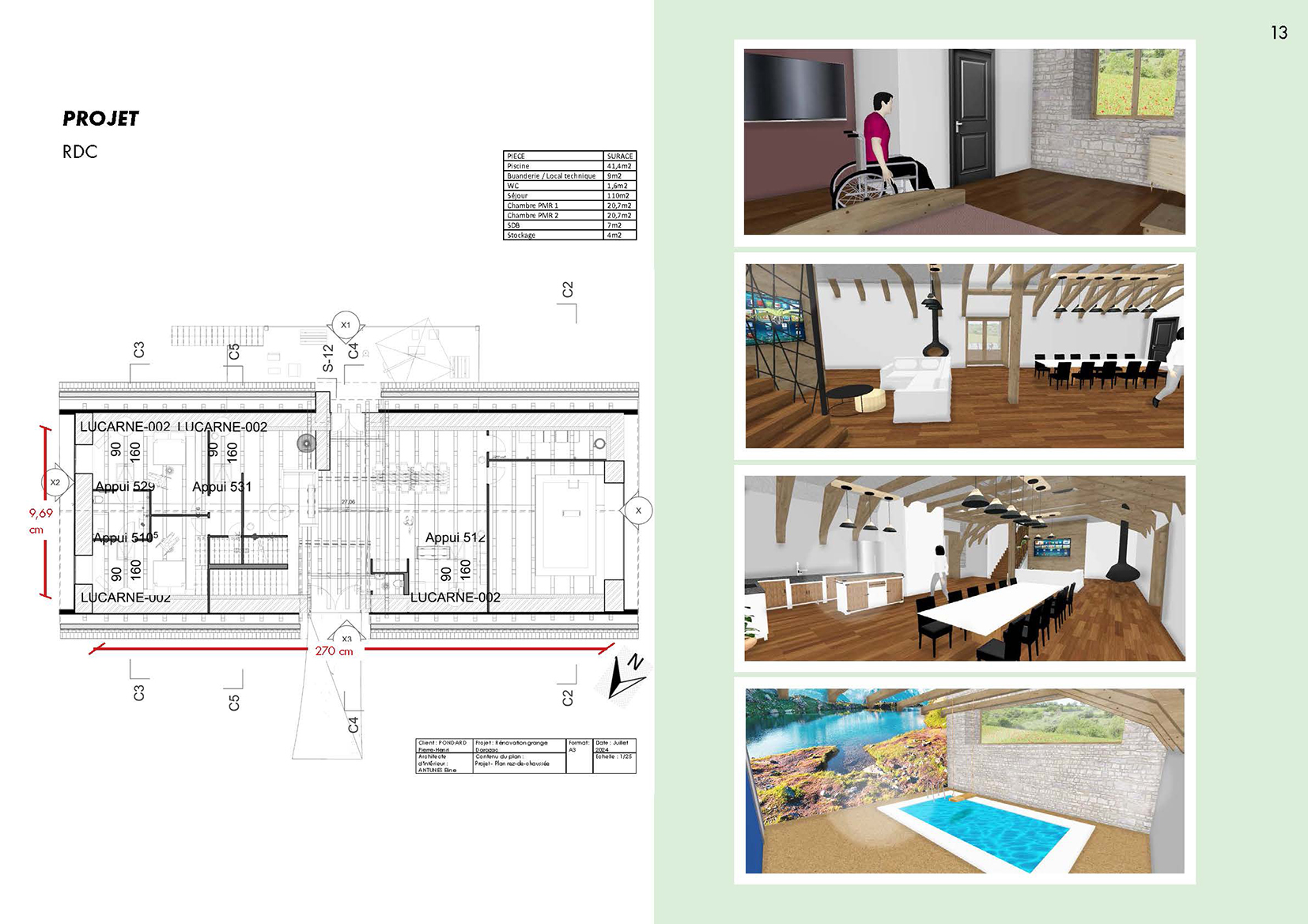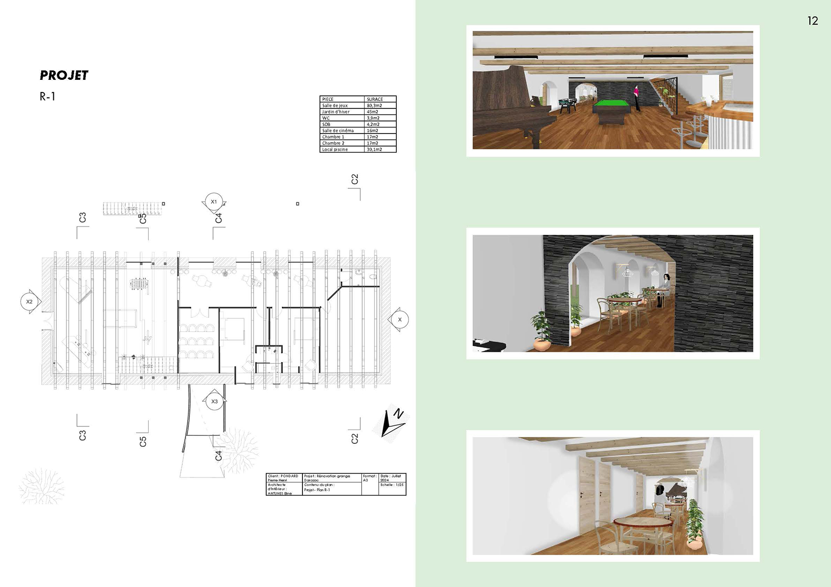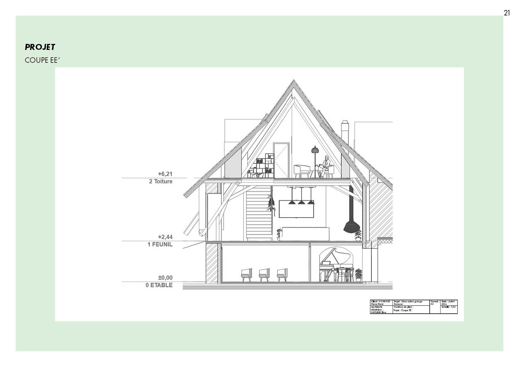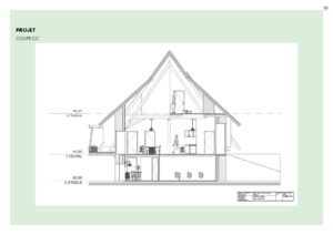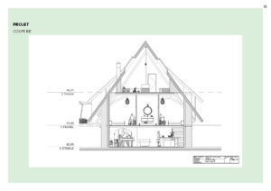 Ce projet propose la réhabilitation d’une grange typique auvergnate de 260 m² au sol, entièrement repensée sur trois niveaux (rez-de-jardin, rez-de-chaussée et étage) pour créer un gîte de France 4 épis. Le projet final développe une surface totale de 780 m², pouvant accueillir une douzaine de personnes dans un cadre confortable, chaleureux et accessible PMR. Il intègre une piscine intérieure, une grande terrasse et des espaces de vie généreux. L’approche architecturale respecte l’âme du bâti rural tout en lui apportant le niveau de confort 4 épis.